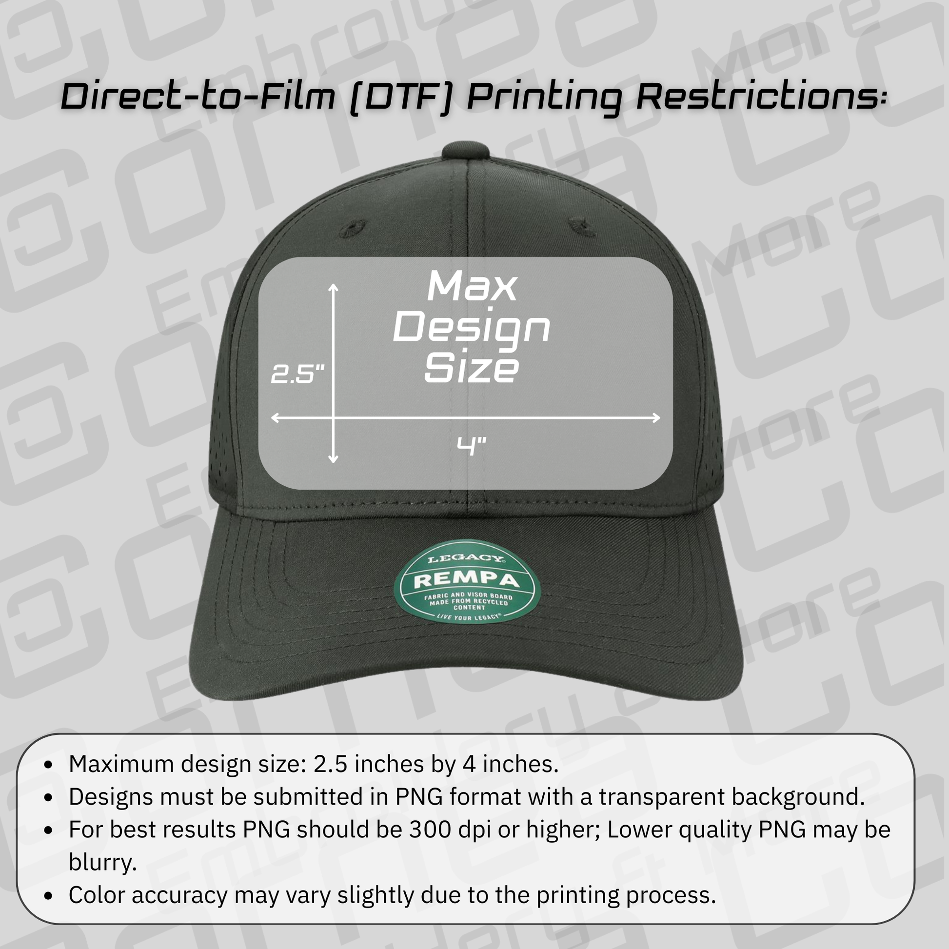 - Character Limit: Limit text to 10-14 characters per line to accommodate the limited space on hat fronts.